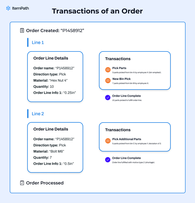 - Transaction 1: Employee X picks 3 parts from Bin A. This empties the bin, and the order line status updates to "In Process".