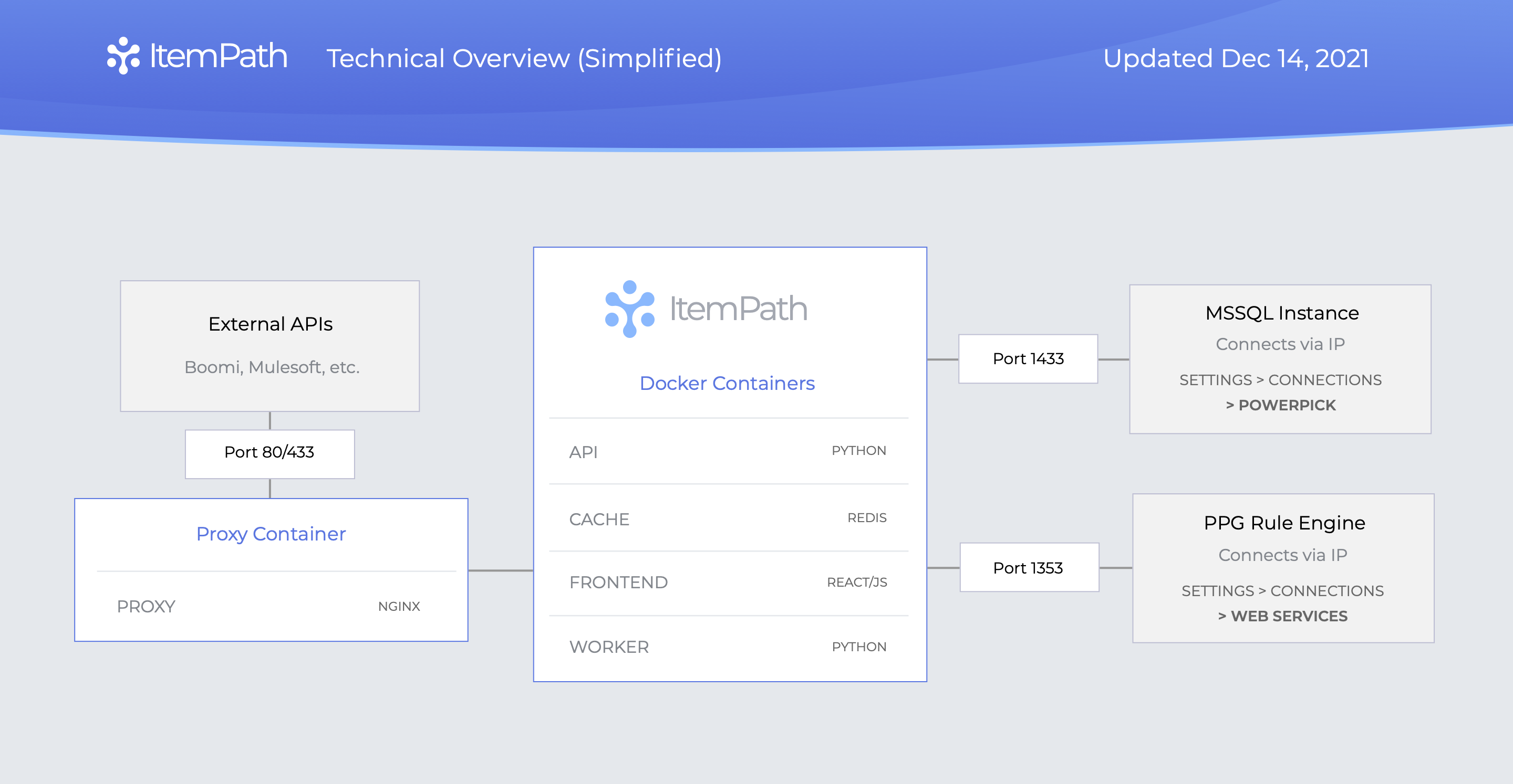 ItemPath acts as a central layer between your external systems and your Power Pick system and storage machines. This diagram illustrates the high-level flow of data from your external system, through ItemPath's central application server, to Power Pick and your MSSQL (Or Oracle) database.