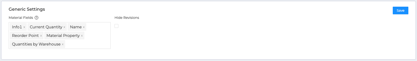 - Material Fields: Choose which fields (e.g., Current Quantity, Material Property, Info1) are visible in the Material Lookup section of the Builder tab.