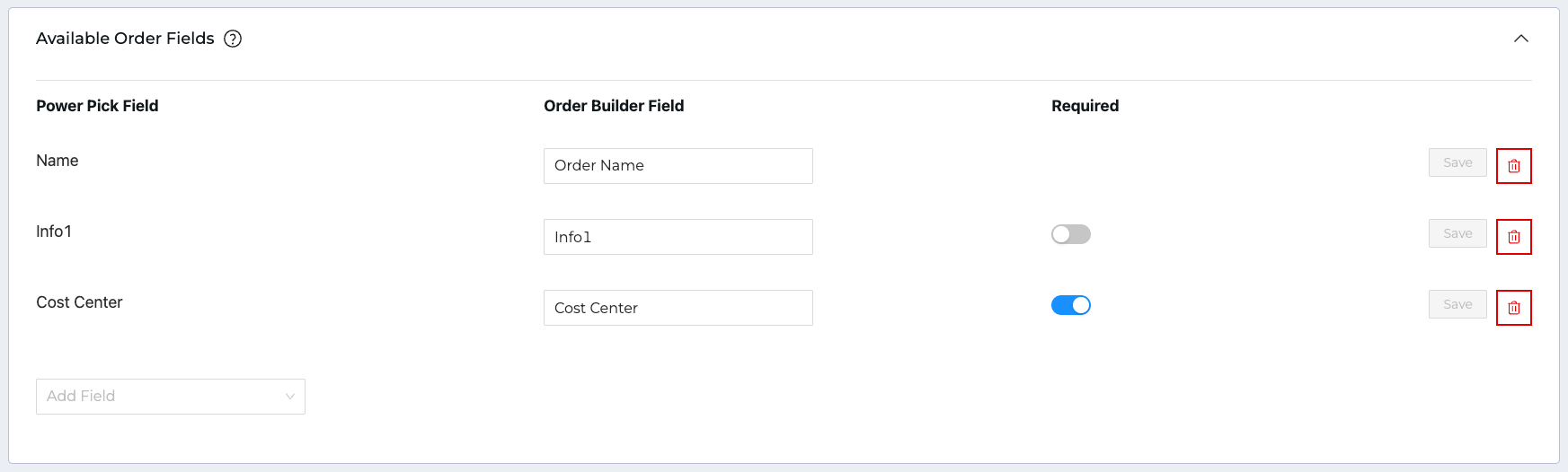 - Select a field from the Add Field dropdown and click Add.