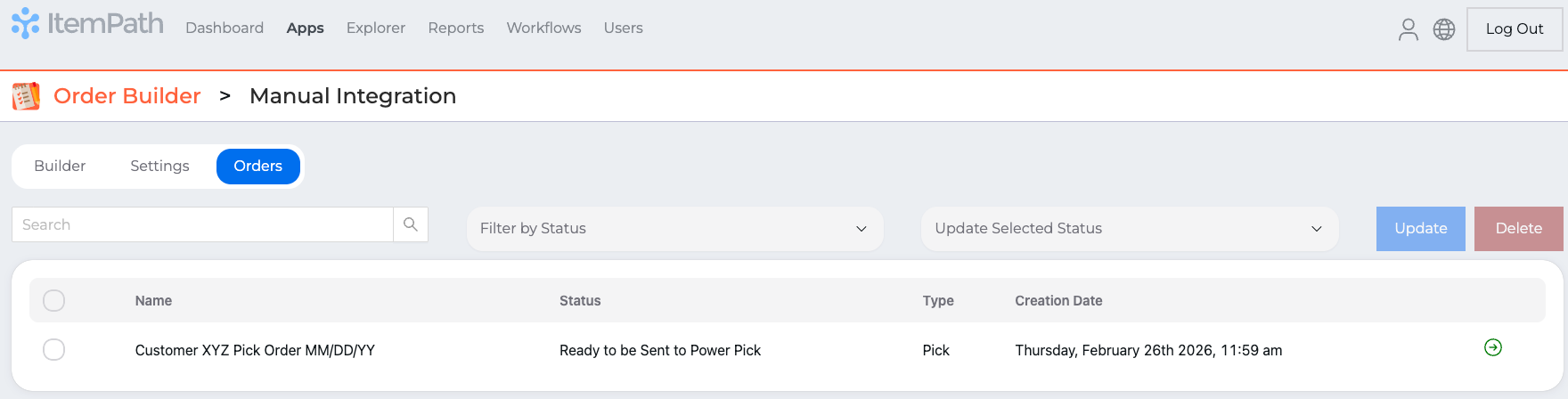 While orders can be created directly in Power Pick - or sent from an external system via the ItemPath API or Data Pull - Order Builder allows you to generate those orders directly within ItemPath. This gives you complete control over order creation through an easy-to-use UI, bridging the gap between your raw data and your warehouse floor. Whether you need to trigger orders automatically based on inventory reports or provide managers with a streamlined manual request form, Order Builder centralizes the process without requiring deep technical knowledge of Power Pick.