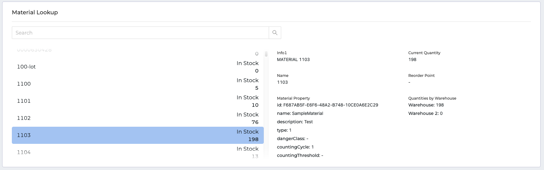 Use this component to search for materials and verify details (like stock levels, current quantity and more) before adding them to an order. This is useful for confirming you are adding the correct materials to the order. The details displayed here are defined on the Settings tab.