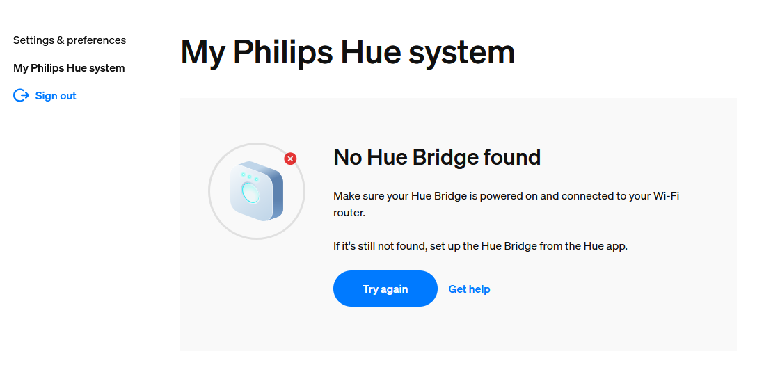 If you receive the message "No Hue Bridge Found", you'll need to review your setup in the Philips Hue mobile app.