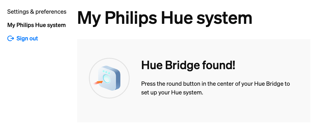 Once you've connected to a home, and a bridge is detected, the site will indicate "Hue Bridge Found". Press the round button in the center of your Hue bridge to connect it with your account.
