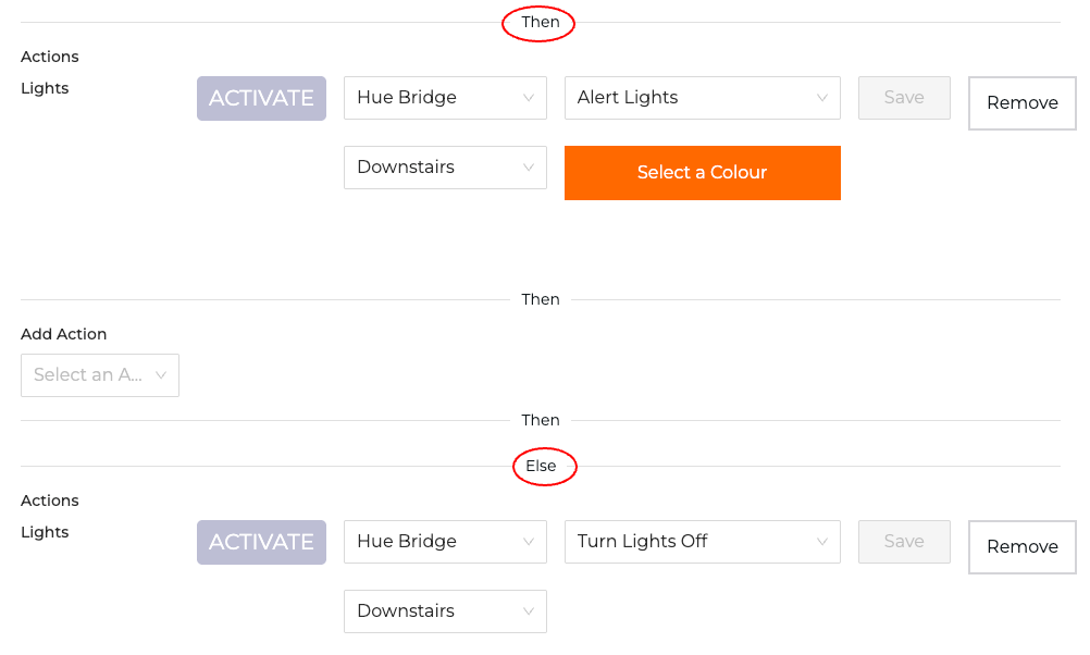 You can set up consecutive 'Then' Actions in your workflow by repeating steps 1 - 6 above. You can also add 'Else' Actions. For example, you can turn a light on when the criteria or your workflow is met, and if not, turn the light off.
